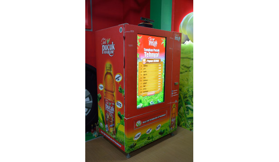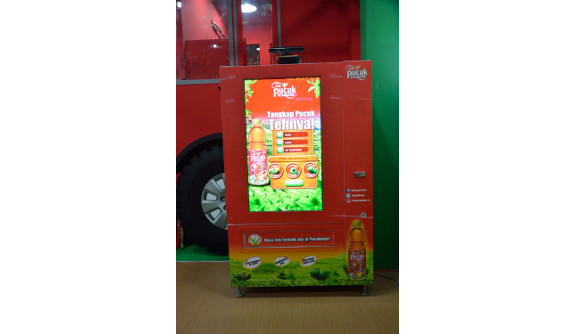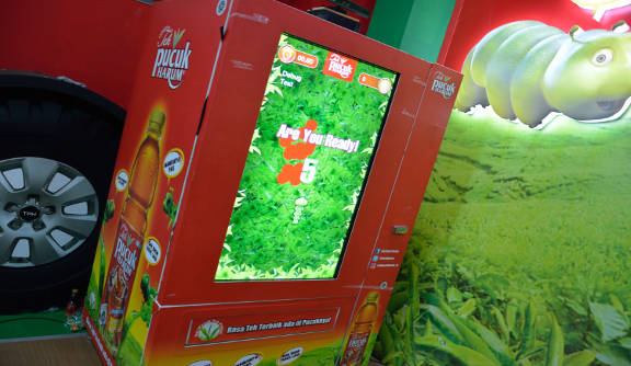 Teh Pucuk Harum dari Mayora, menampilkan game interaktif dengan mendeteksi pergerakan tubuh untuk menggerakkan objek (ulat) menghindari rintangan.